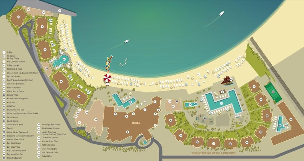DoubleTree by Hilton Resort & Spa Marjan Island je 5* hotel a nachází se na uměle vybudovaném ostrově Marjan Island, v blízkosti Al Hamra, v letovisku Ras Al Khaimah. Hotel nabízí nabízí 650 metrů dlouhou soukromou písečnou pláž. Tento resort má až 14 restaurací a barů, z toho několik tematických restaurací, střešní bar a bary u bazénu. Nechybí ani lounge nebo noční klub. K dispozici je nově zrekonstruovaný dětský klub s hracími automaty pro starší děti a venkovním hřištěm, aquapark Pirate Boat s mnoha vodními skluzavkami, kde se pobaví celá rodina, vodní hřiště, takzvaná "Tarzanova loď". V resortu je také fitness centrum, 7 bazénů a i bazén s nastavitelnou teplotou, včetně bazénů pro děti a lázně s místnostmi pro procedury, saunou. |